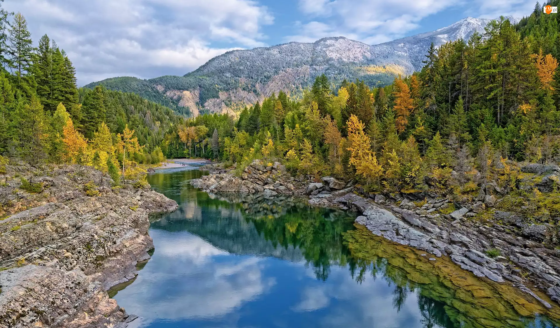 Chmury, Las, Drzewa, Flathead River, Stan Montana, Stany Zjednoczone, Góry, Park Narodowy Glacier, Rzeka, Jesień
