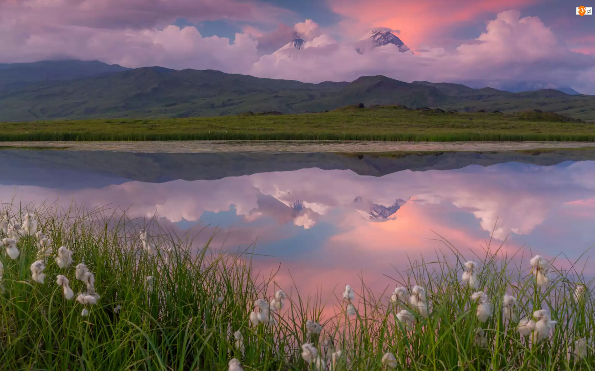 Jezioro, Góry, Odbicie, Roślinność, Chmury, Trawa