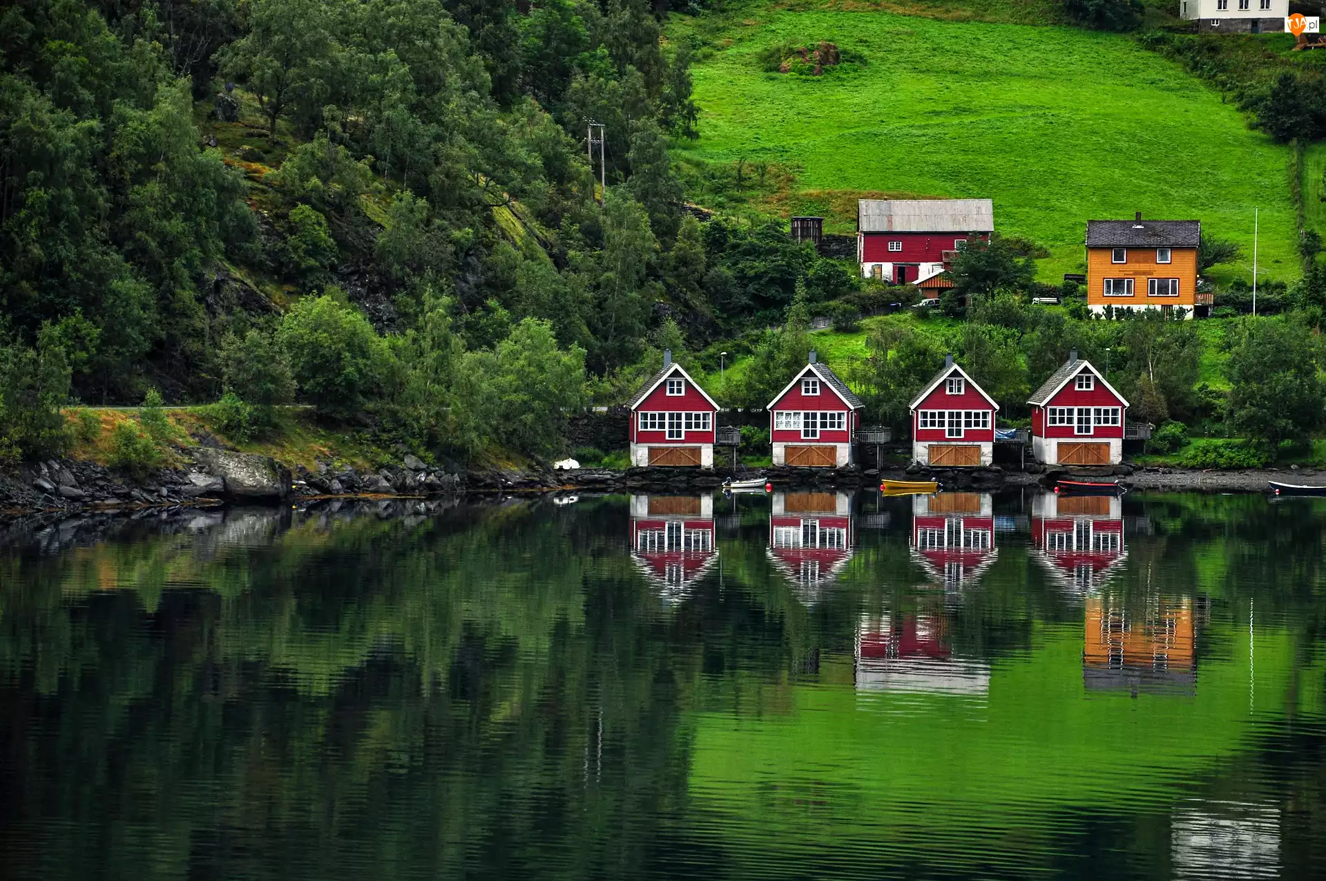 Jezioro, Odbicie, Domki, Czerwone, Drzewa