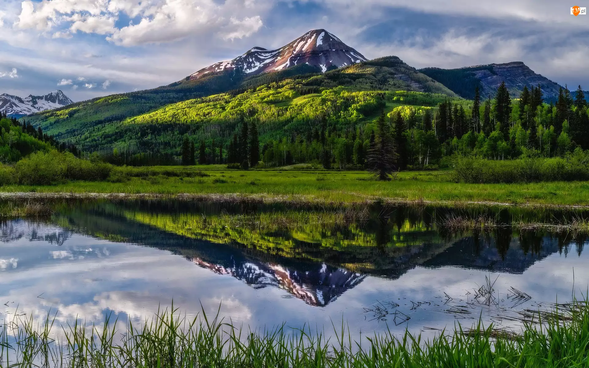 Odbicie, Góry, Drzewa, Stan Kolorado, San Juan Mountains, Chmury, Stany Zjednoczone, Jezioro