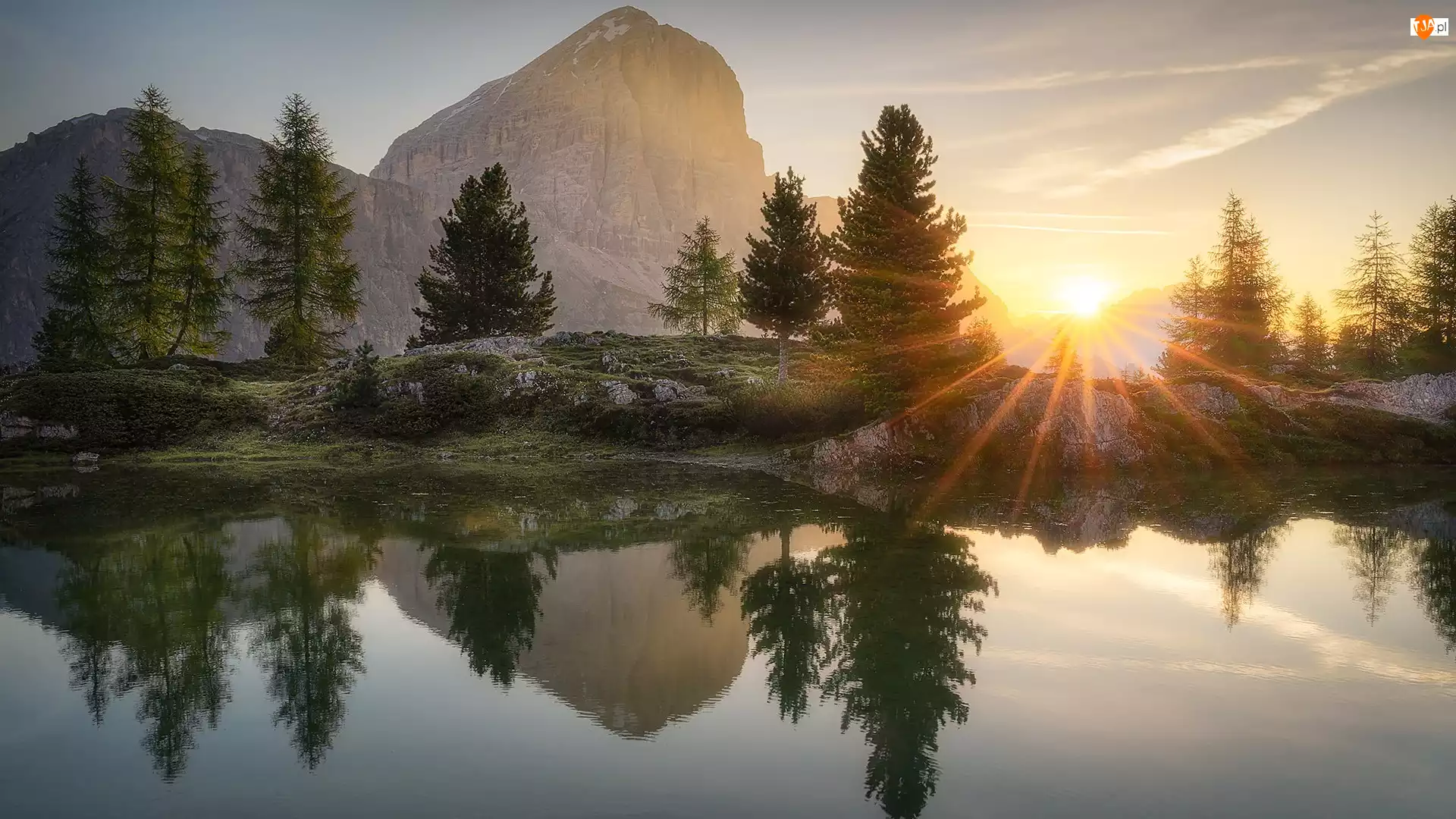 Odbicie, Góry, Lago Limides, Promienie słońca, Dolomity, Drzewa, Włochy, Jezioro