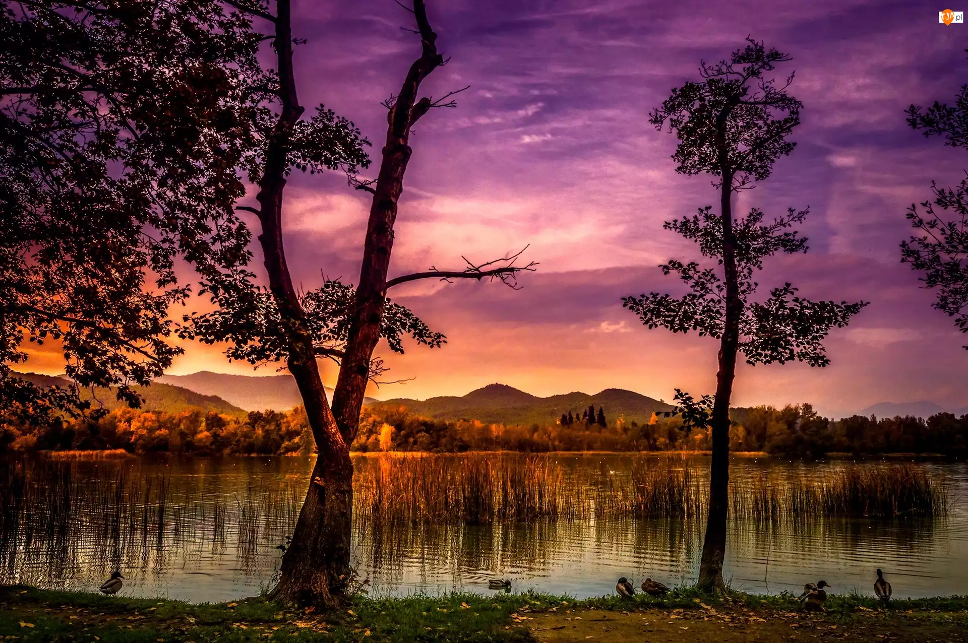 Drzewa, Odbicie, Zmierzch, Jezioro, Góry