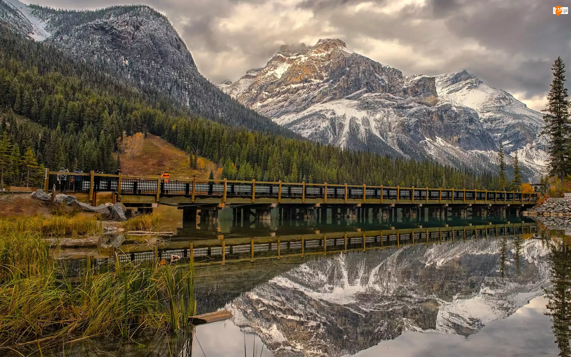 Odbicie, Kolumbia Brytyjska, Drzewa, Emerald Lake, Most, Park Narodowy Yoho, Góry, Kanada, Jezioro