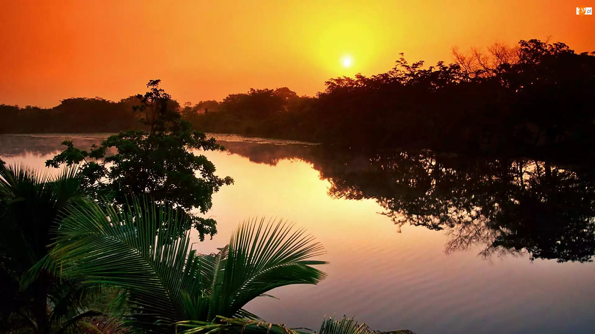 Odbicie, Rzeka, Zachód, Drzewa, Słońca