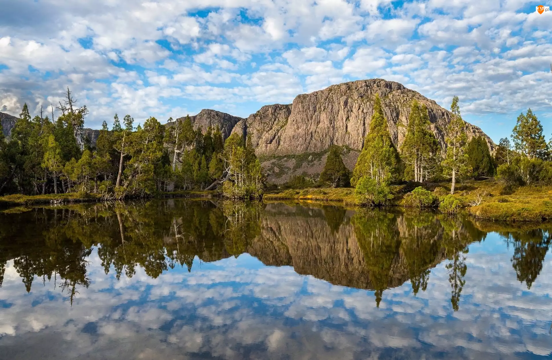 Odbicie, Skały, Drzewa, Jezioro , Chmury