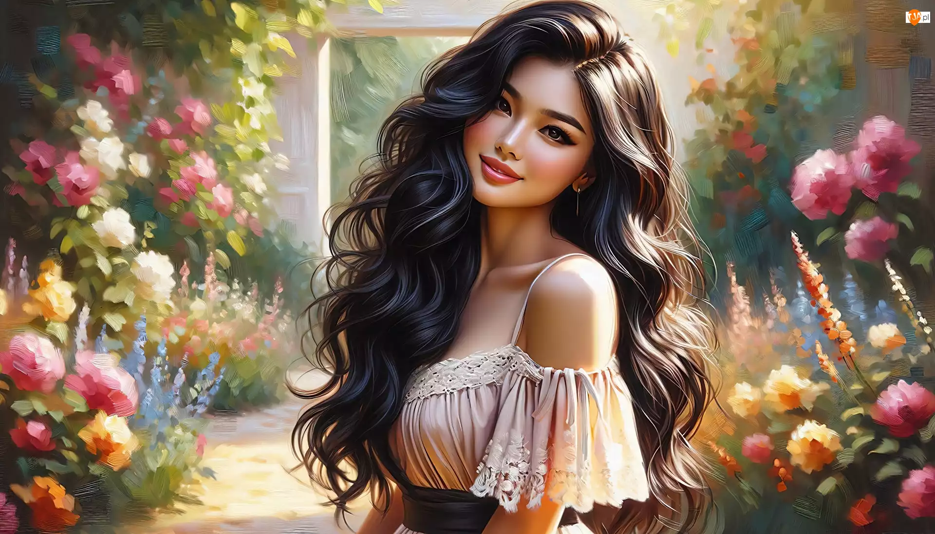 Ogród, Grafika, Uśmiech, Kobieta, Kwiaty