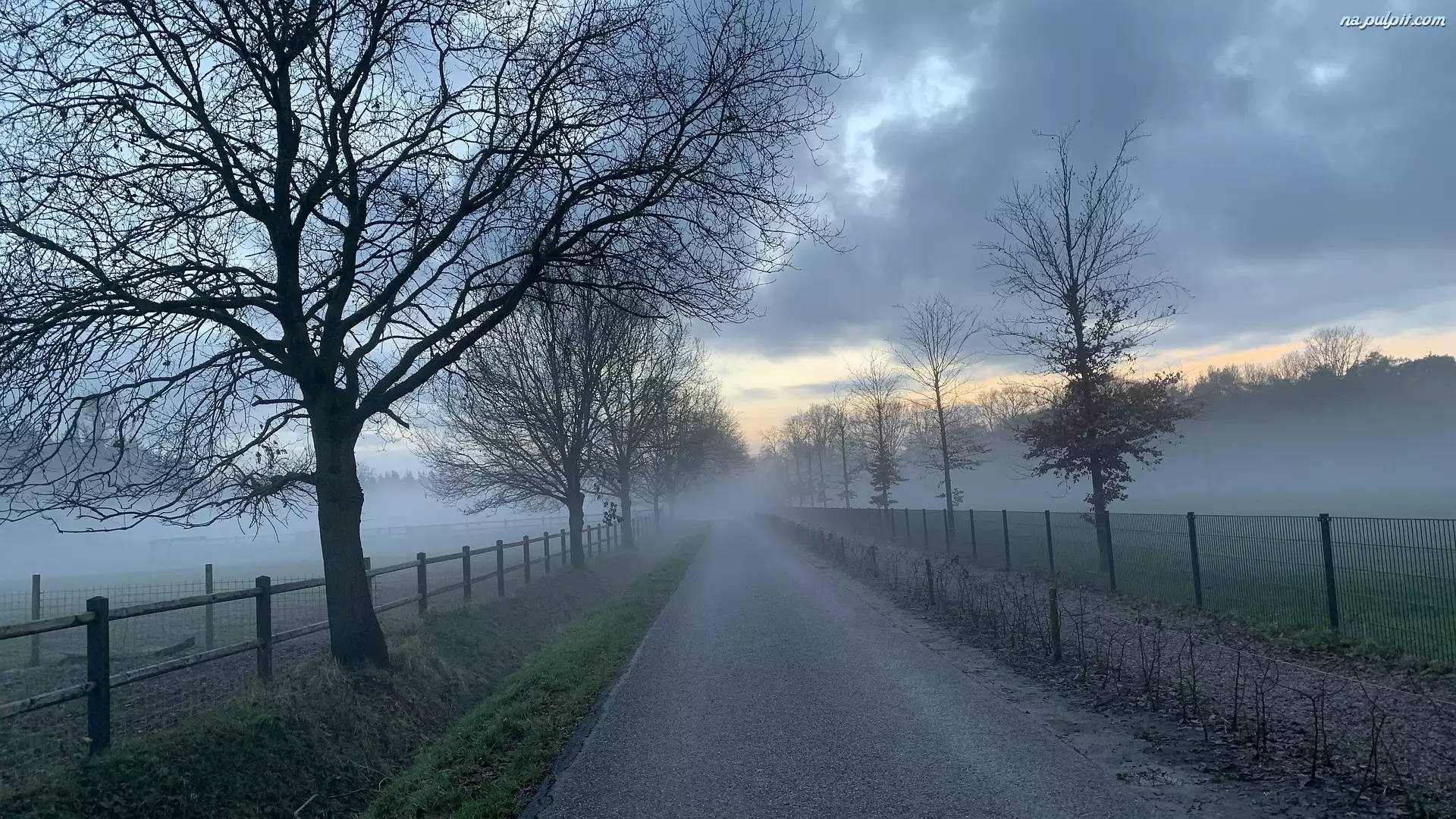 Drzewa, Mgła, Chmury, Droga, Pola, Jesień, Ogrodzenie