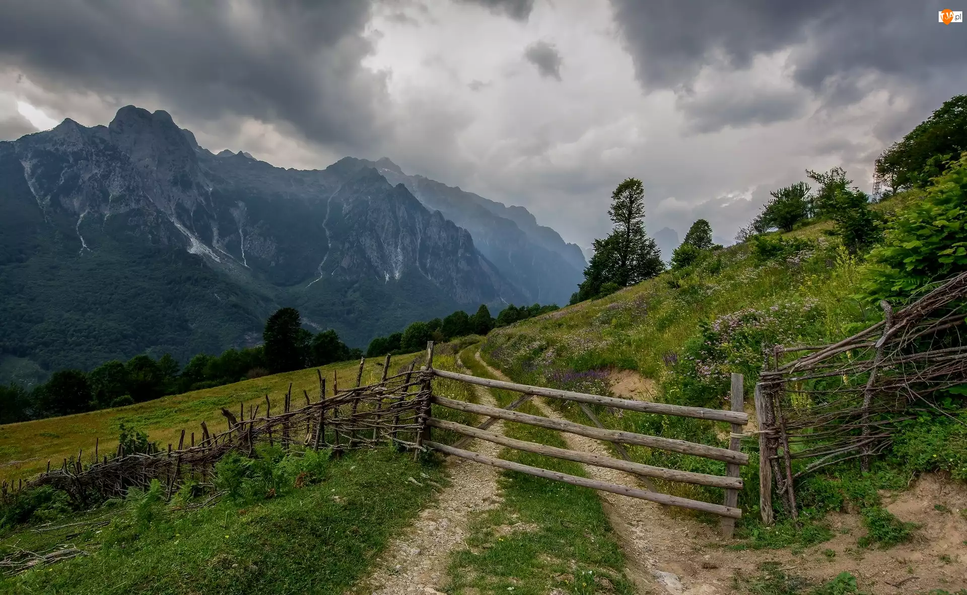Drzewa, Droga, Łąka, Góry, Ogrodzenie