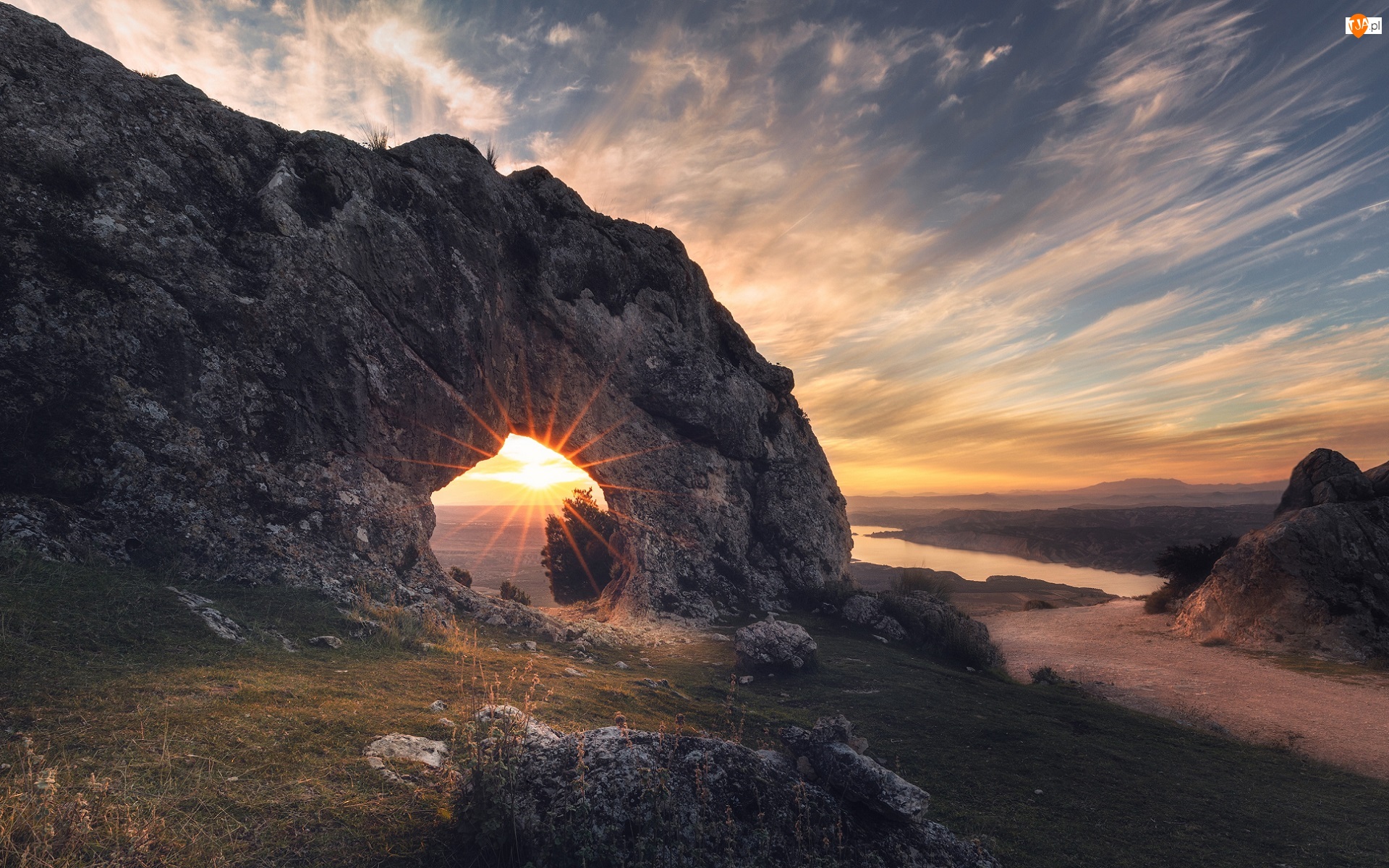 Ojo De La Heredad, Zachód słońca, Rzeka, Grenada, Skała, Taras widokowy, Hiszpania, Łuk skalny