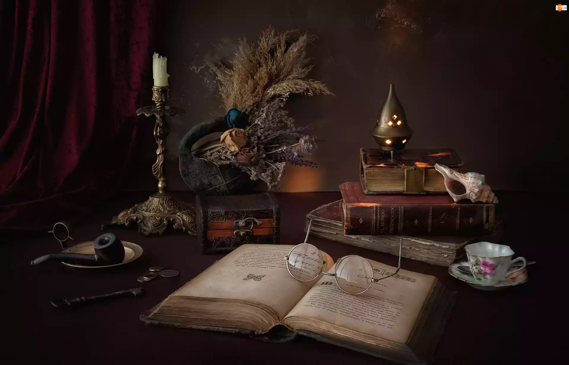 Bibeloty, Okulary, Stare, Kompozycja, Świeca