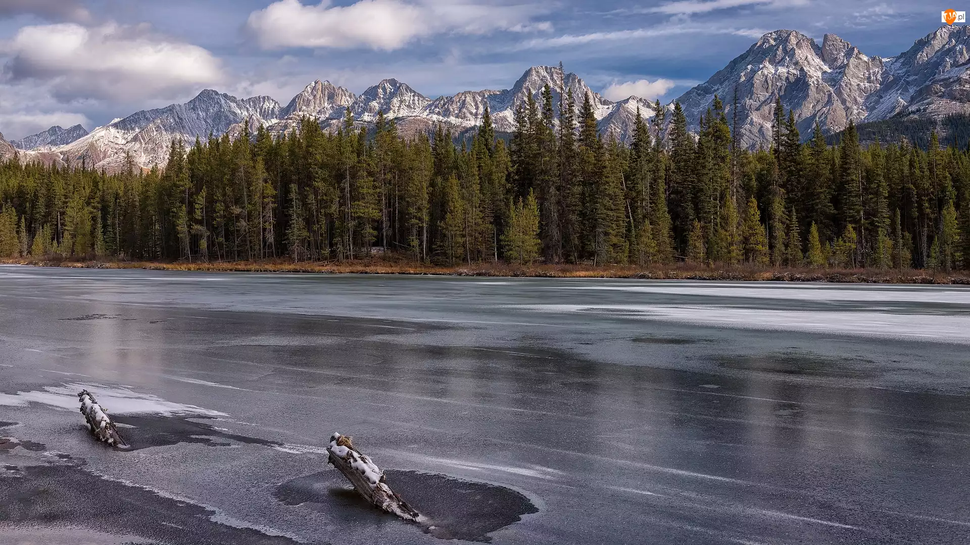 Opal Mountain Range, Drzewa, Spillway Lake, Alberta, Las, Zima, Kanada, Jezioro