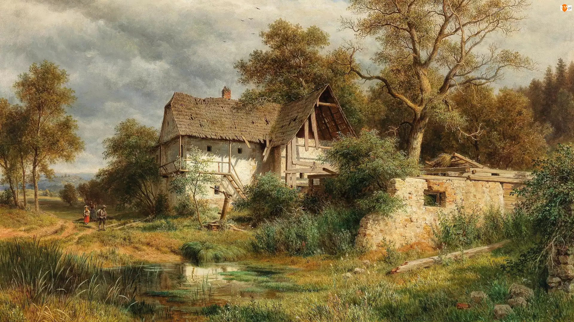 Drzewa, Malarstwo, Dom, Staw, Obraz, Ruiny, Dolina Laabach, Ludwig Halauska