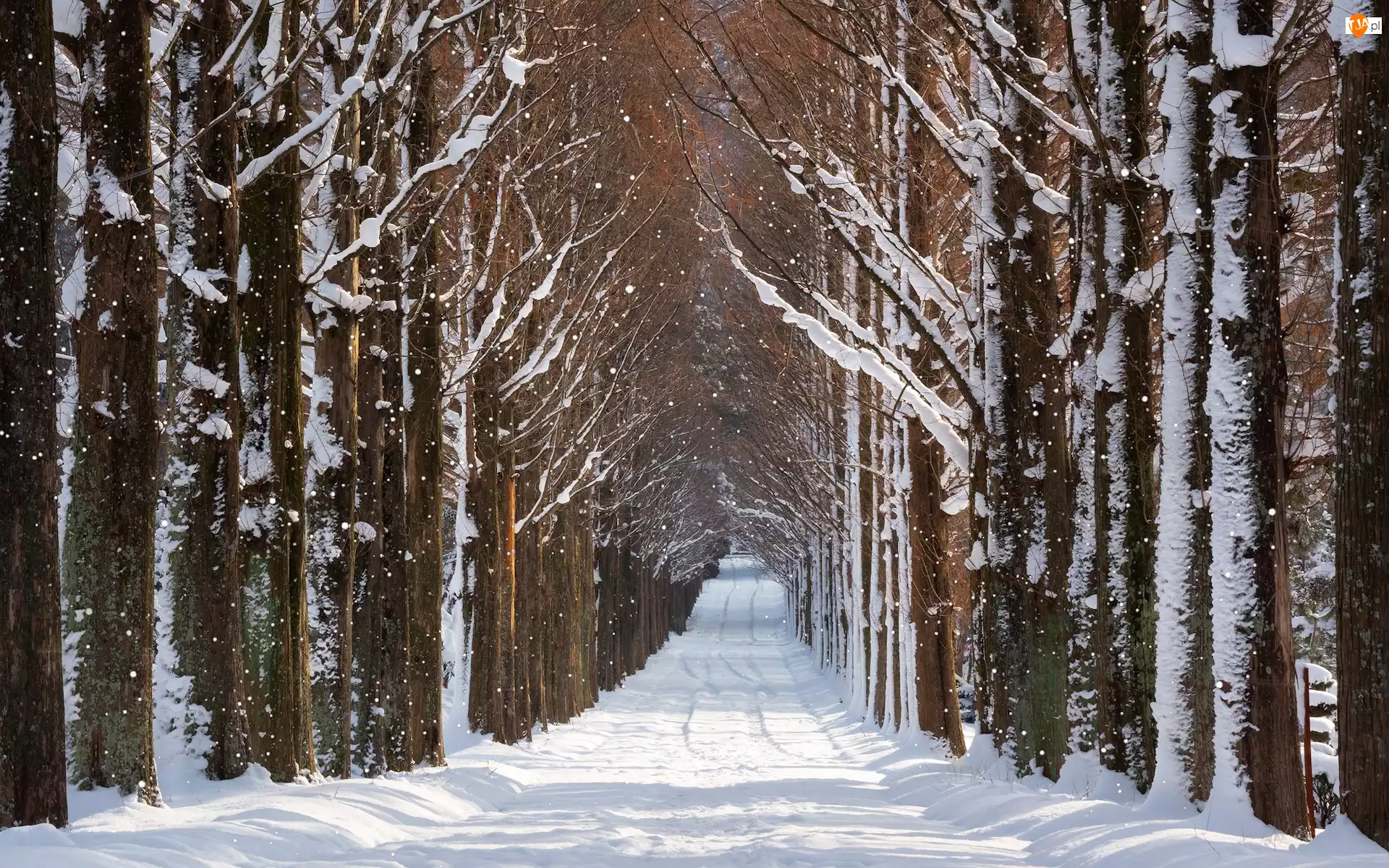 Drzewa, Droga, Aleja, Zima, Ośnieżona