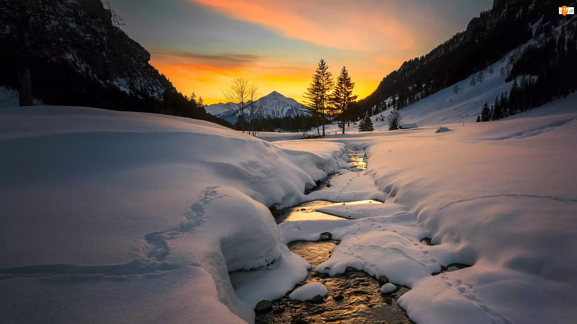 Góry, Drzewa, Zachód słońca, Zima, Ślady, Śnieg, Rzeka