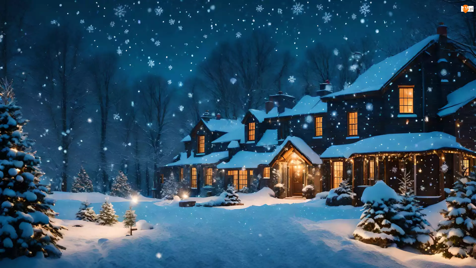 Oświetlenie, 2D, Domy, Zima, Choinki