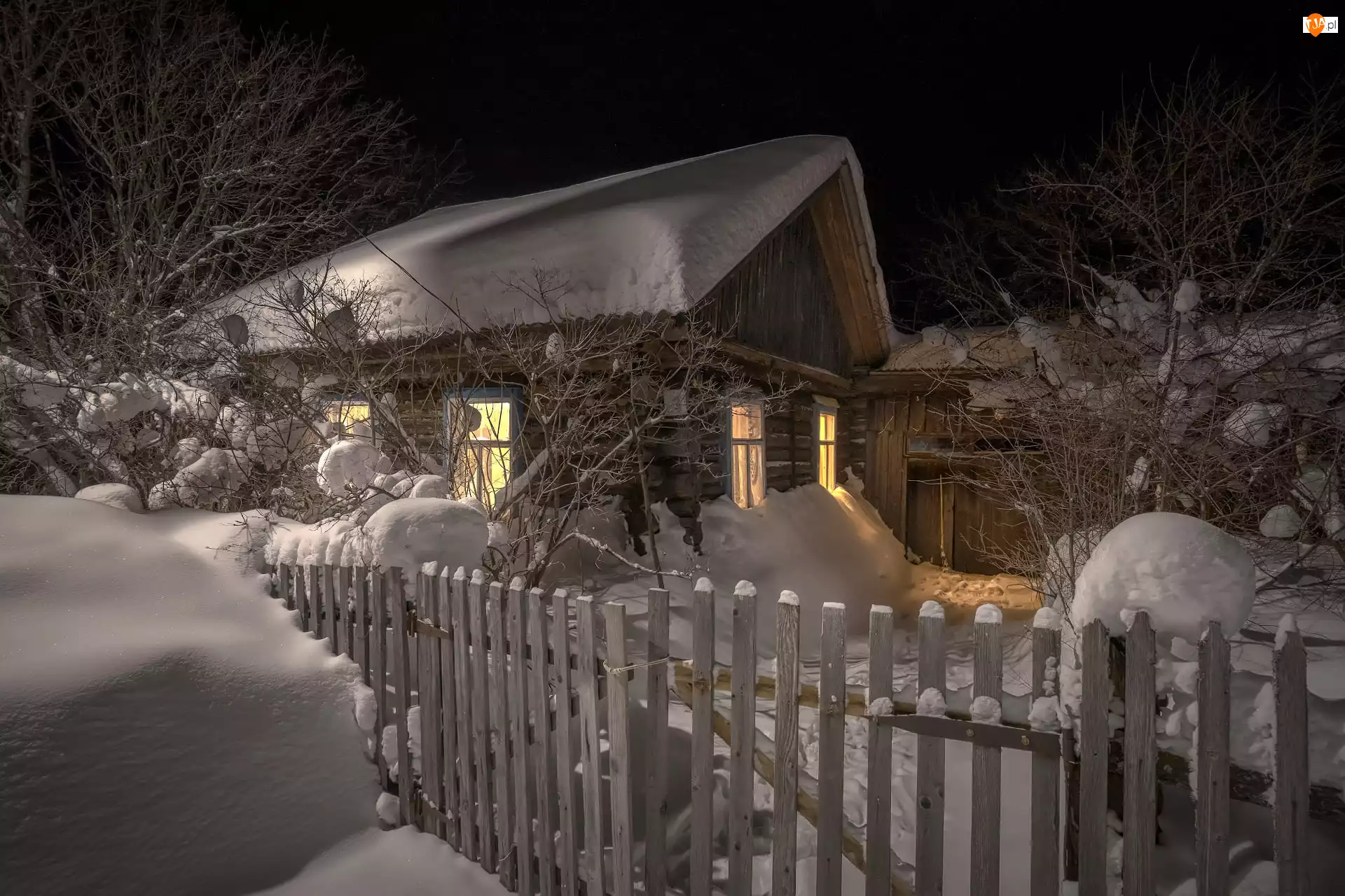 Ośnieżone, Drewniany, Zaspy, Płot, Stary, Śnieg, Drzewa, Zima, Światła, Dom, Noc