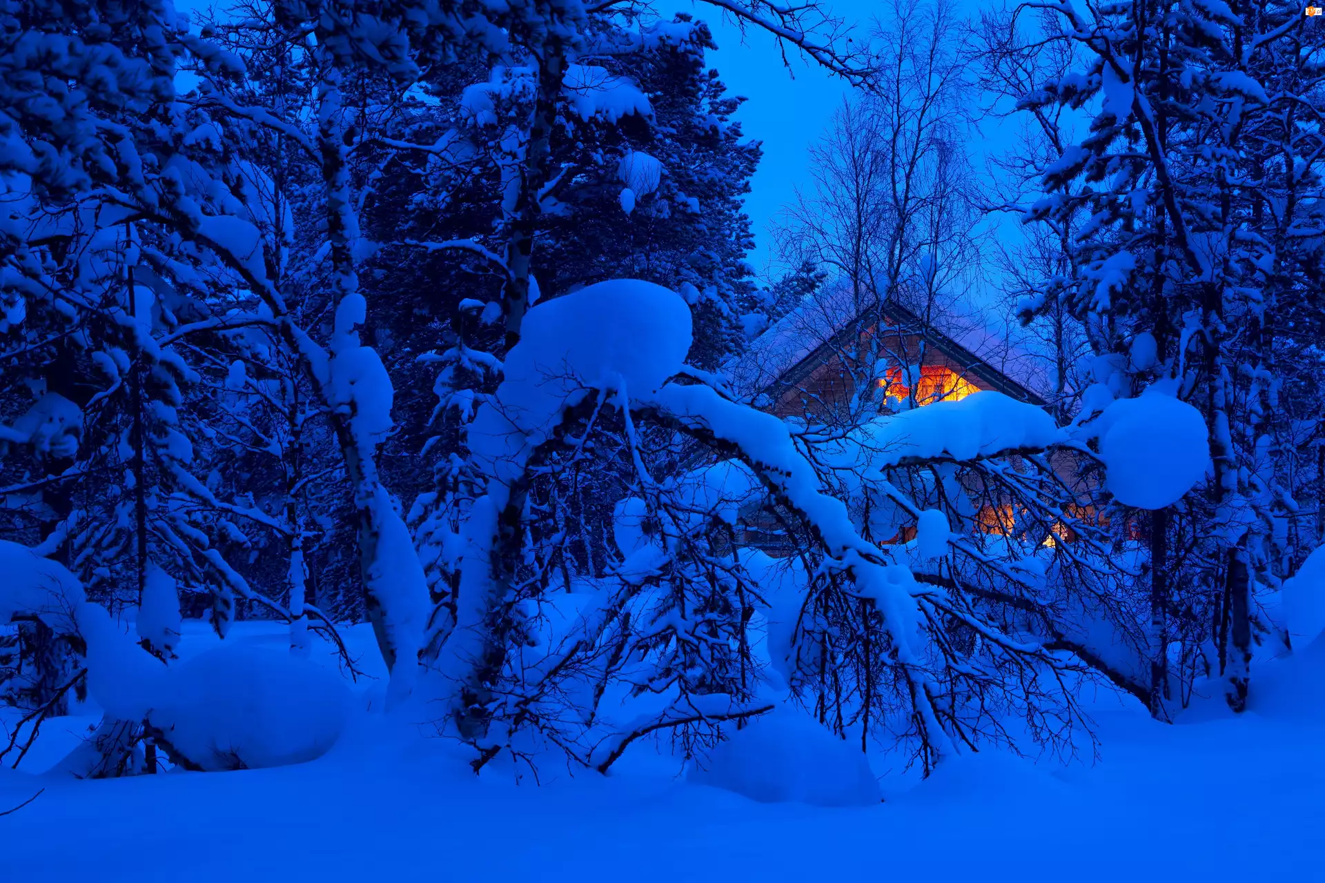 Zmrok, Zima, Drzewa, Ośnieżone, Dom