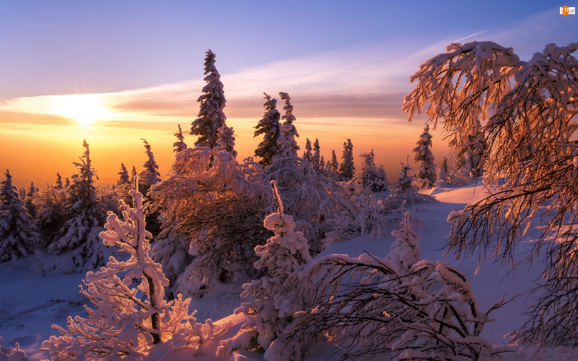 Ośnieżone, Wschód słońca, Las, Zima, Drzewa