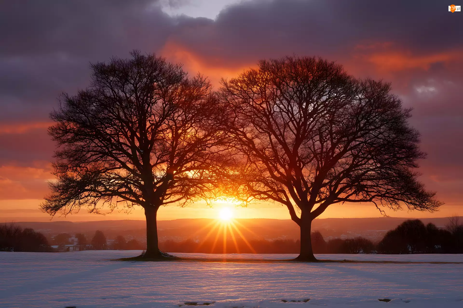 Ośnieżone, Pole, Grafika AI, Zima, Zachód słońca, Drzewa, Dwa