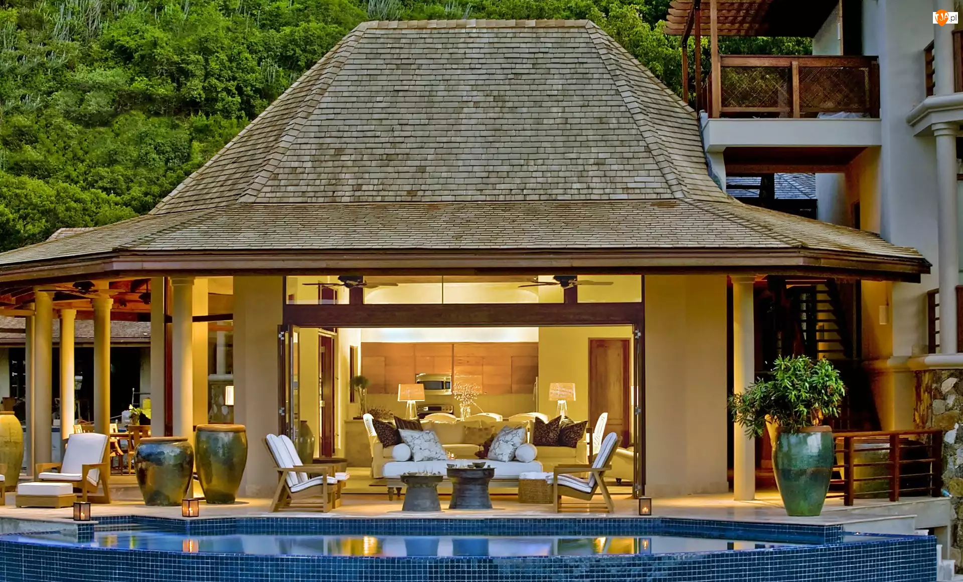 Oświetlony, Ogród, Dom, Basen, Wnętrze, Salon
