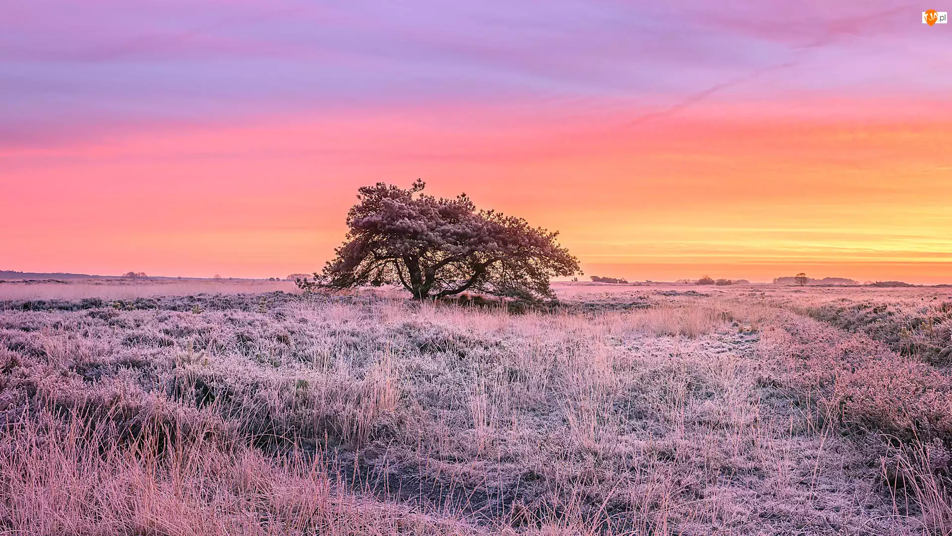 Szron, Zachód słońca, Wrzosowisko, Drzewo