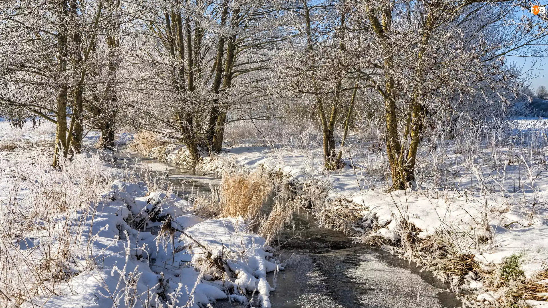 Oszronione, Zima, Drzewa, Strumień, Trawy, Rzeka