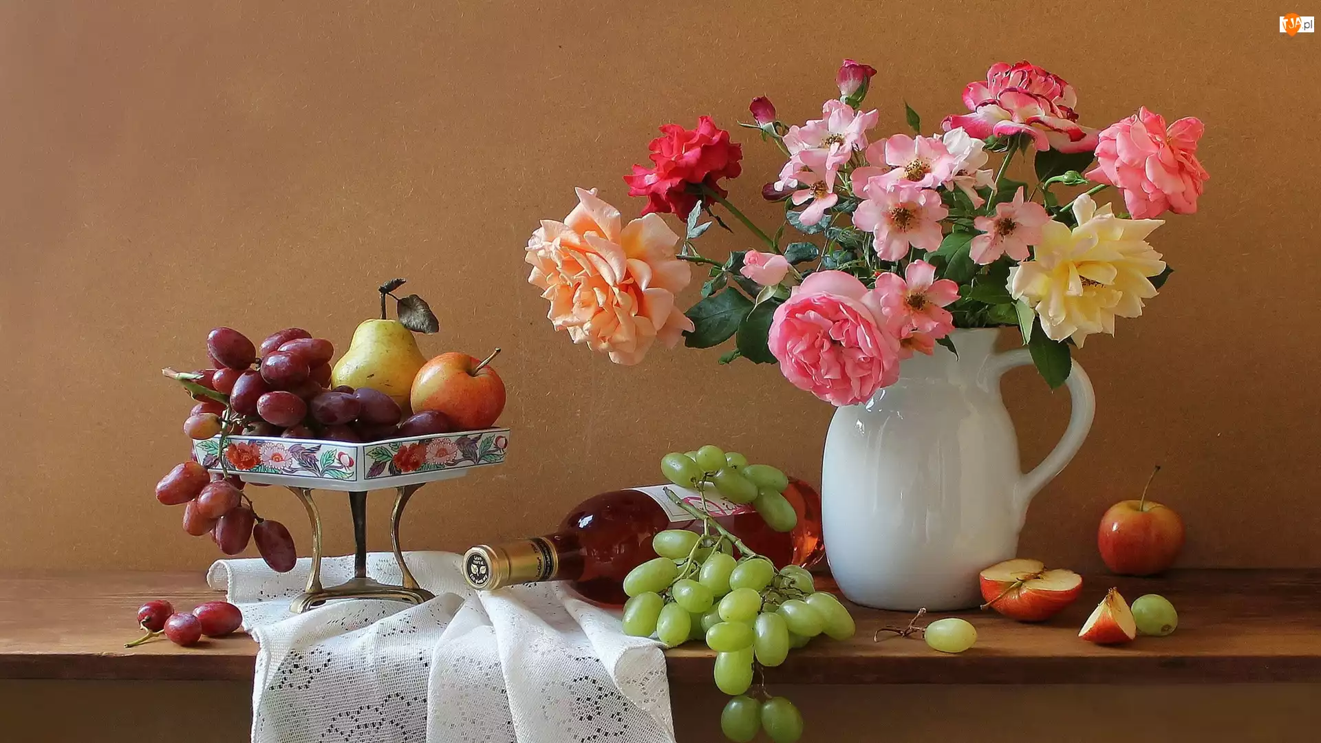Owoce, Jabłka, Bukiet, Winogrona, Kompozycja, Wino, Róże, Gruszka