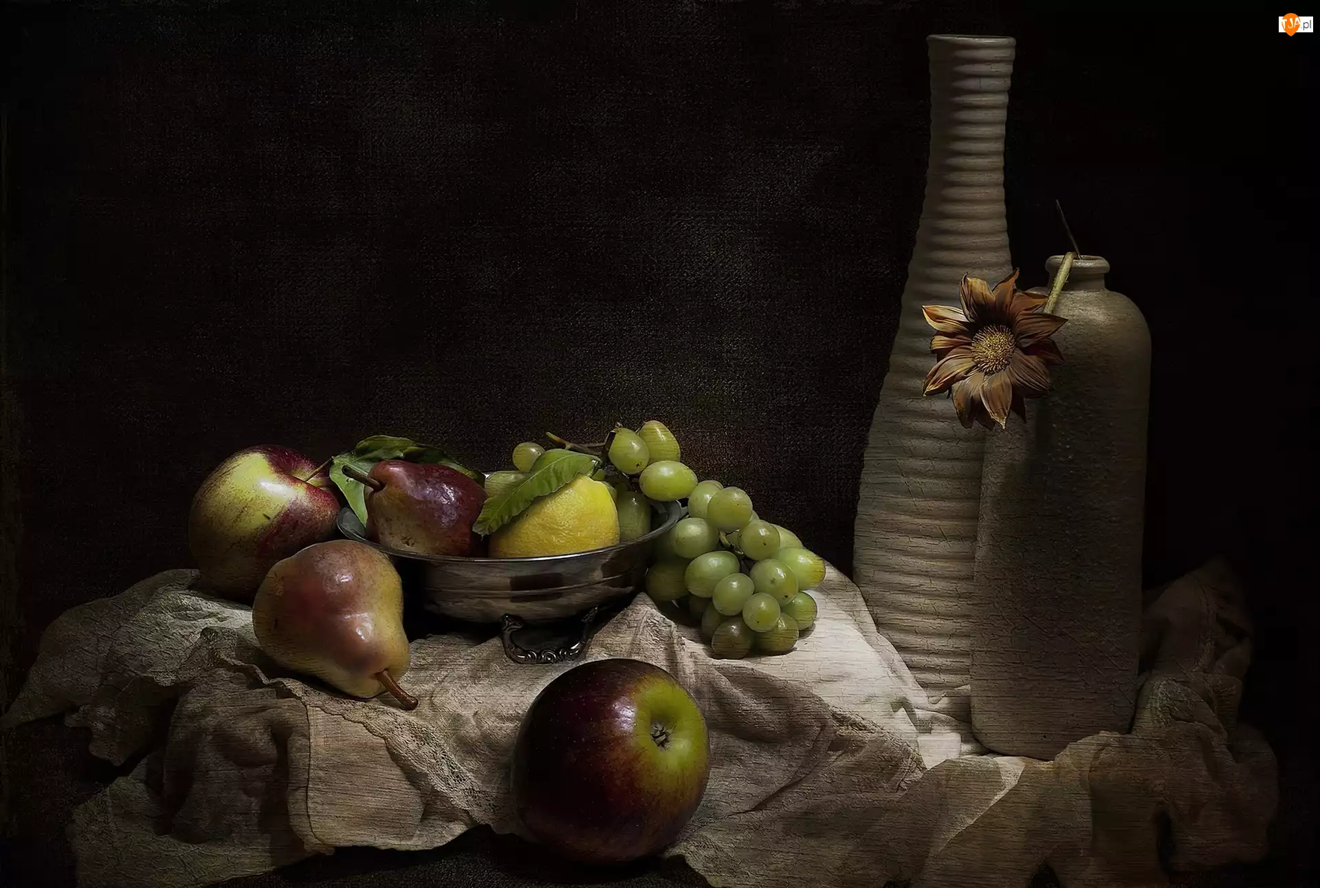 Owoce, Jabłka, Wazony, Kompozycja, Winogrona, Cytryna, Gruszki