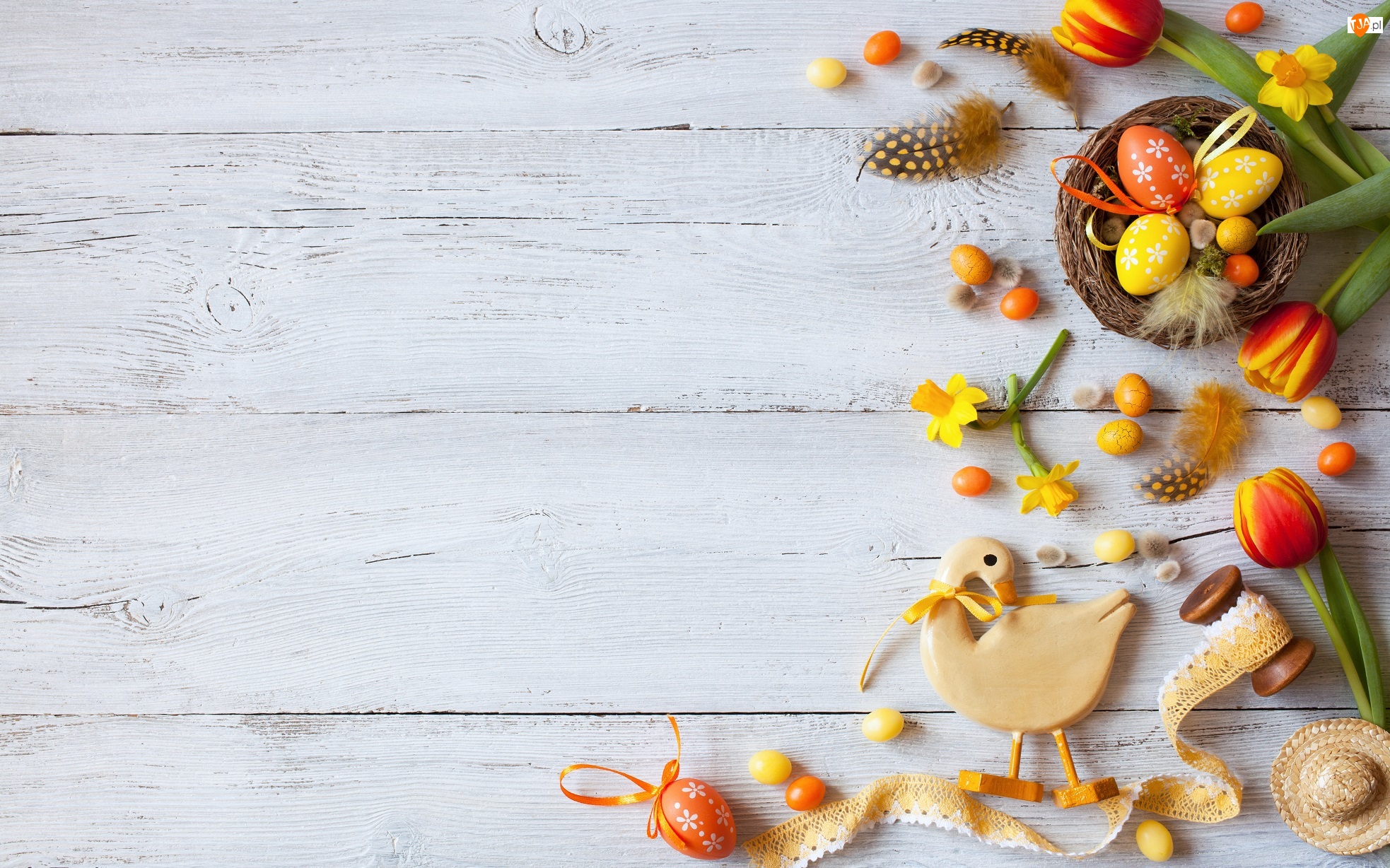 Piórka, Pisanki, Kapelusz, Drewniana, Gąska, Koszyk, Żonkile, Wielkanoc, Tulipany