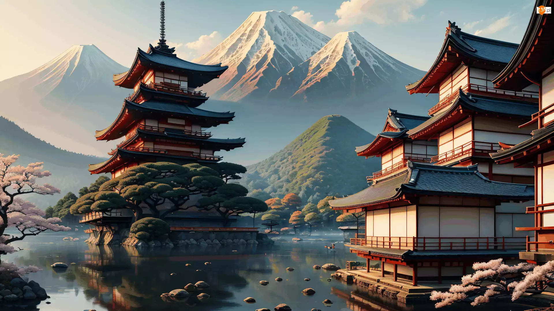 Jezioro, Grafika, Domy, Pagoda, Góry