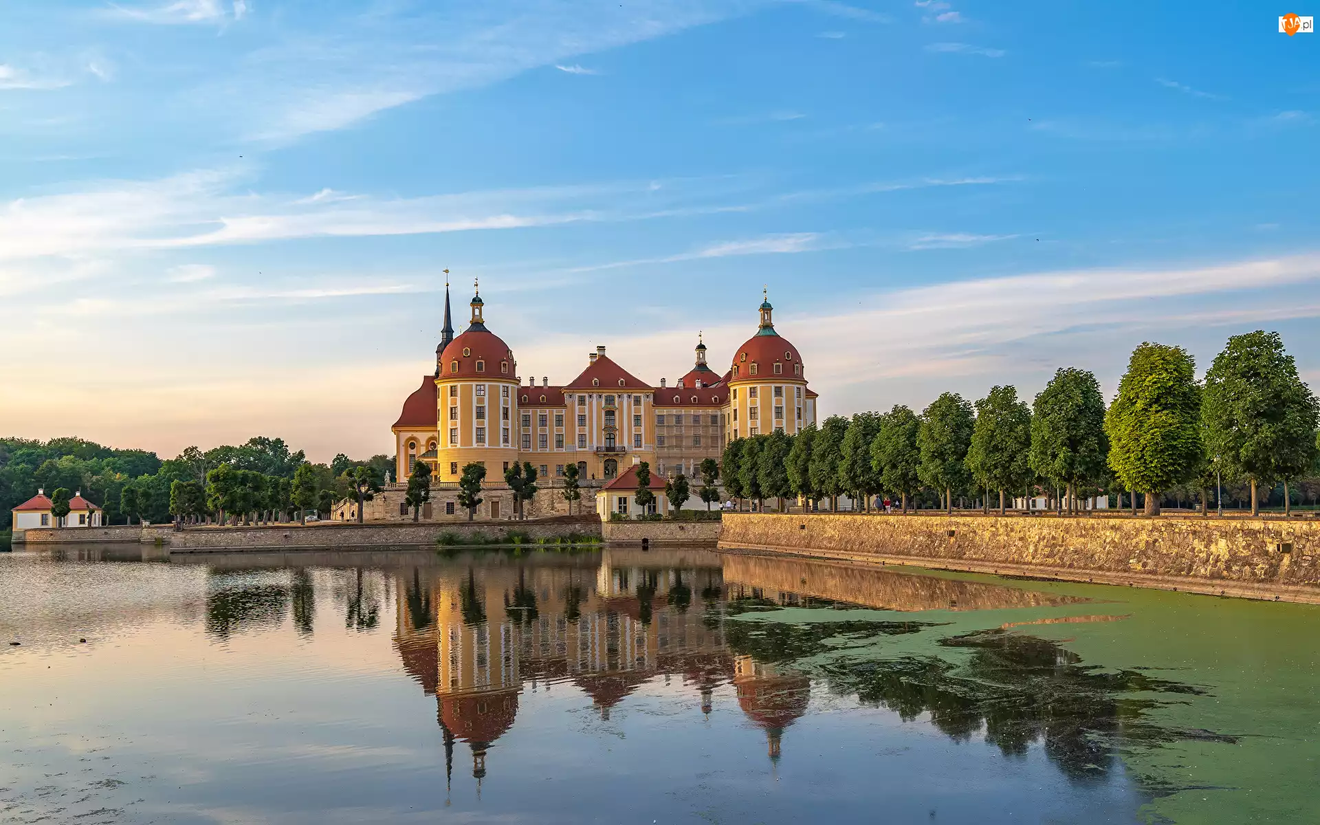 Saksonia, Pałac Moritzburg, Niebo, Niemcy, Drzewa, Odbicie, Jezioro