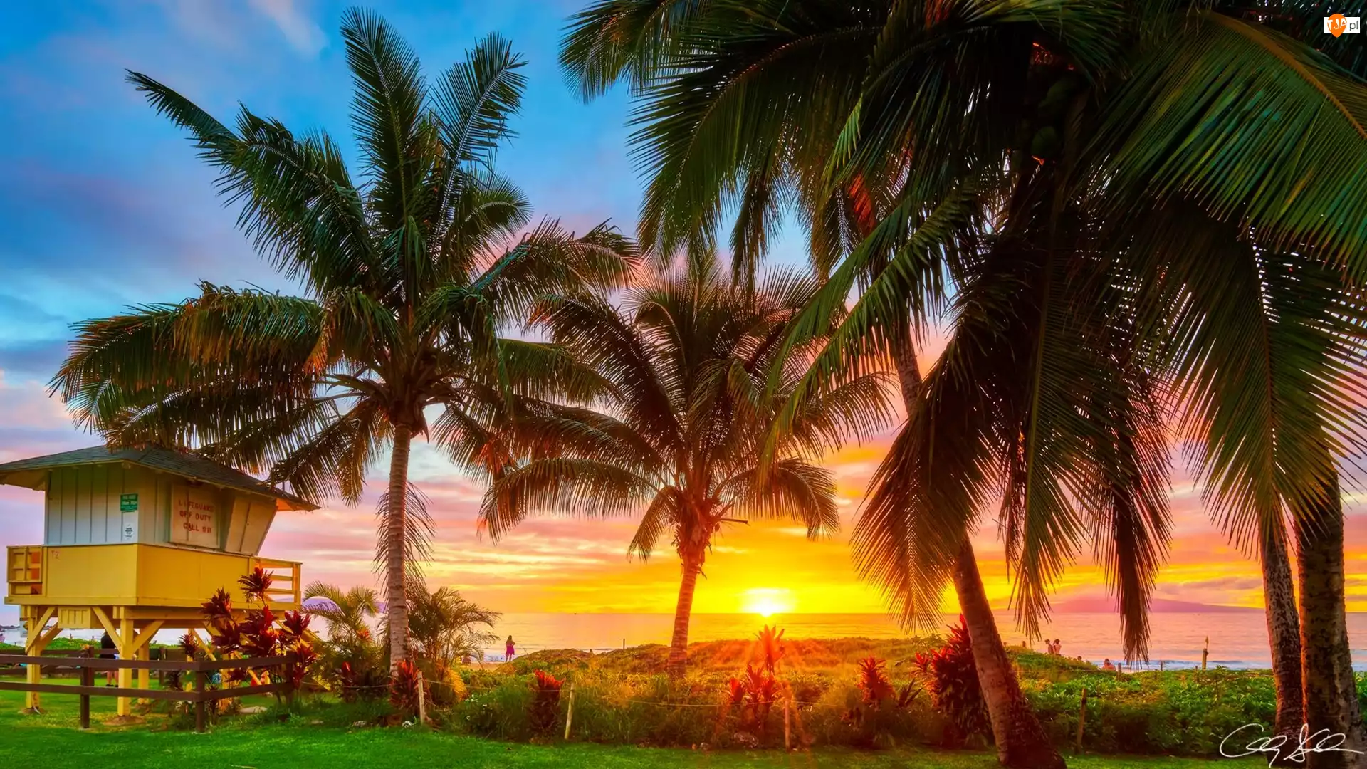Palmy, Wieża ratownicza, Morze, Hawaje, Wschód słońca