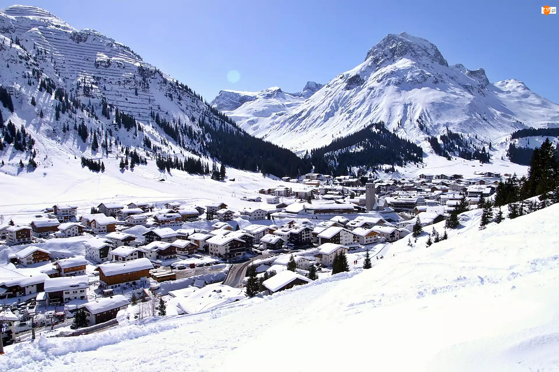 Zima, Góry, Kurortu, Tyrol, Panorama, Dolina, Las