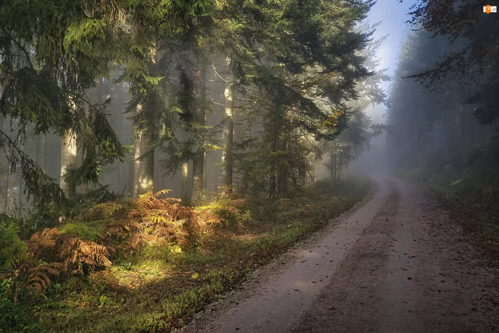 Słoneczny, Jesień, Paprocie, Blask, Las, Droga, Mgła, Drzewa