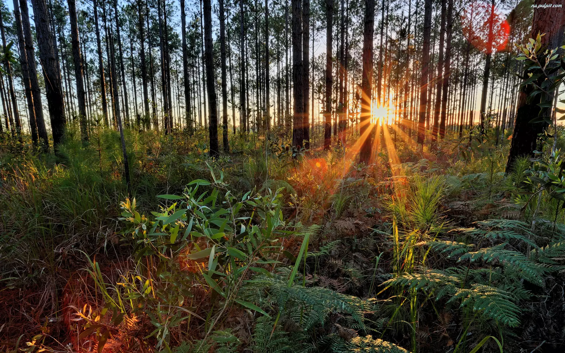 Paprocie, Promienie, Las, Słońca, Drzewa, Trawy