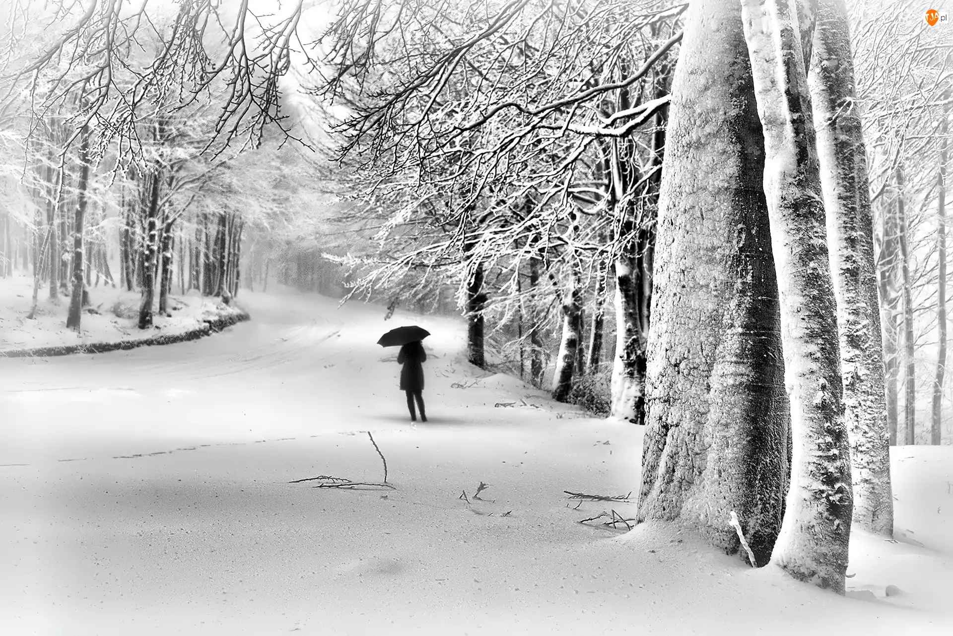 Parasol, Droga, Śnieg, Drzewa, Postać