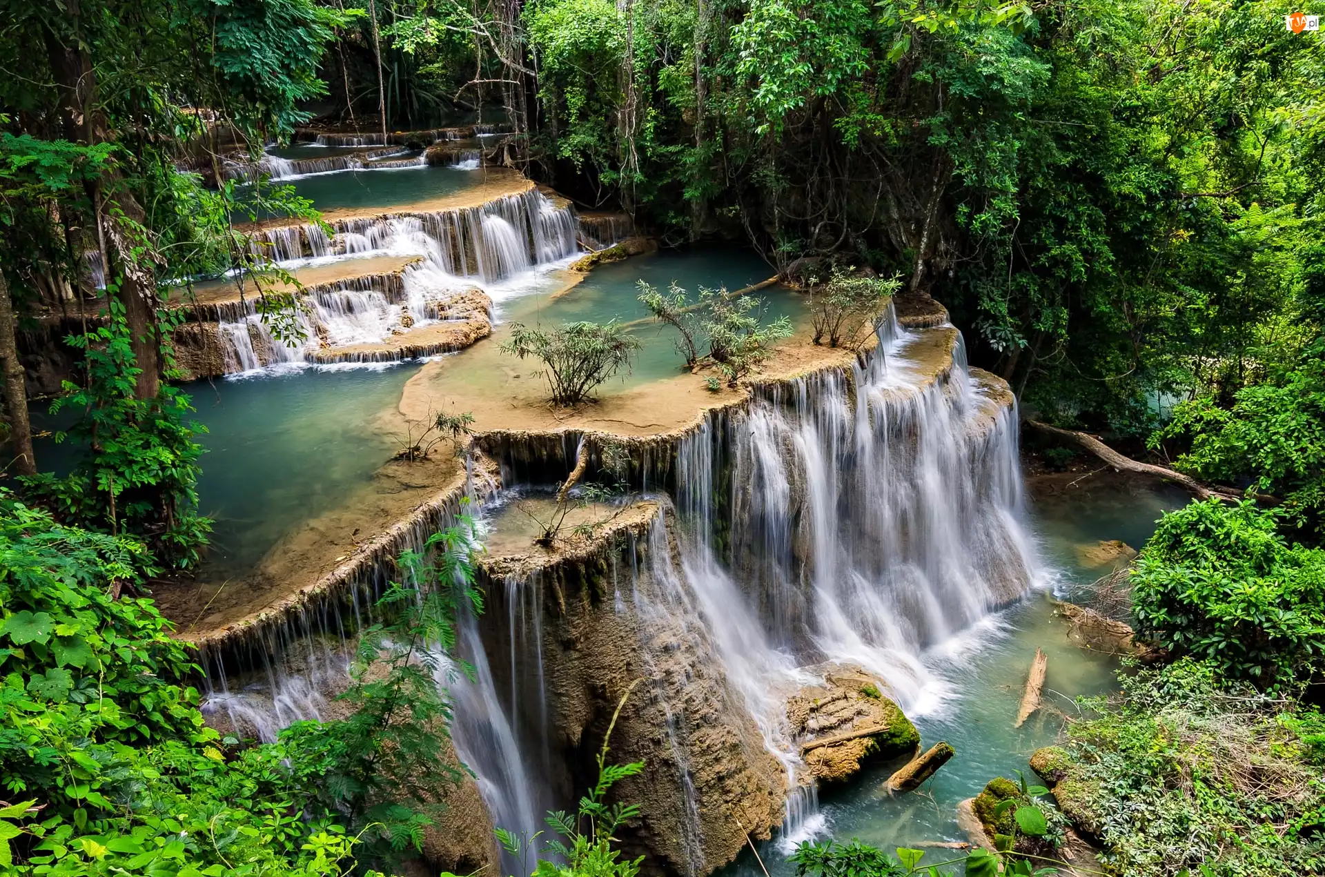 Kaskada, Wodospad Erawan, Park Narodowy Erawan, Tajlandia, Drzewa, Prowincja Kanchanaburi