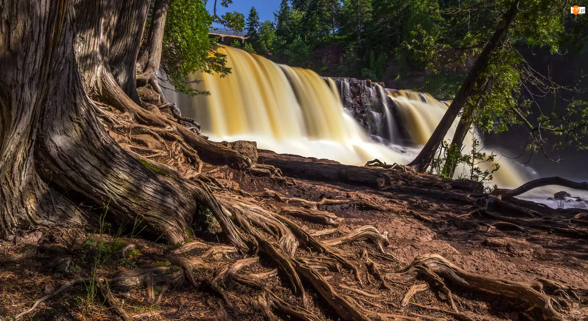 Park stanowy Gooseberry Falls, Drzewo, Gooseberry Falls, Minesota, Korzenie, Most, Stany Zjednoczone, Wodospad