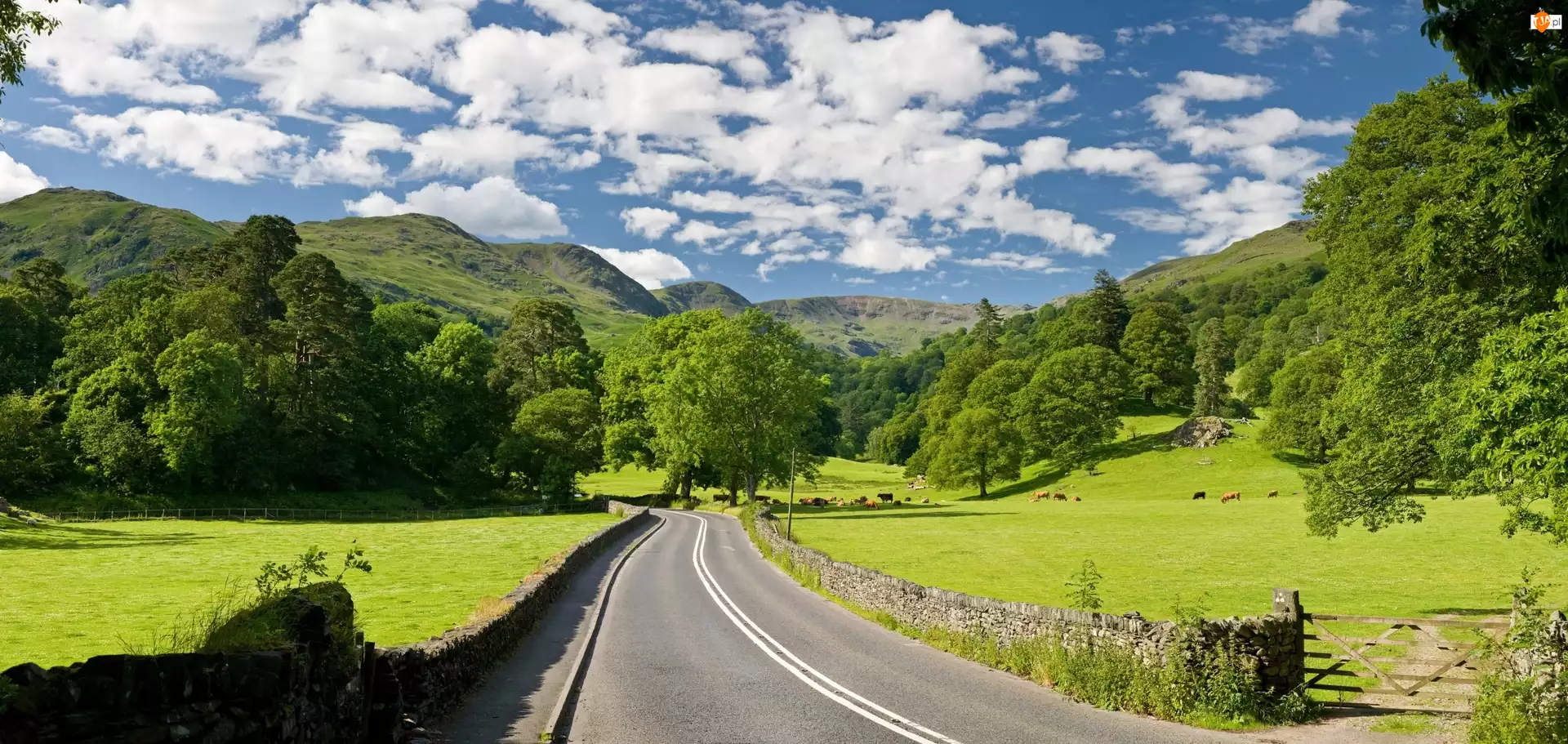 Chmury, Pastwisko, Drzewa, Góry, Droga