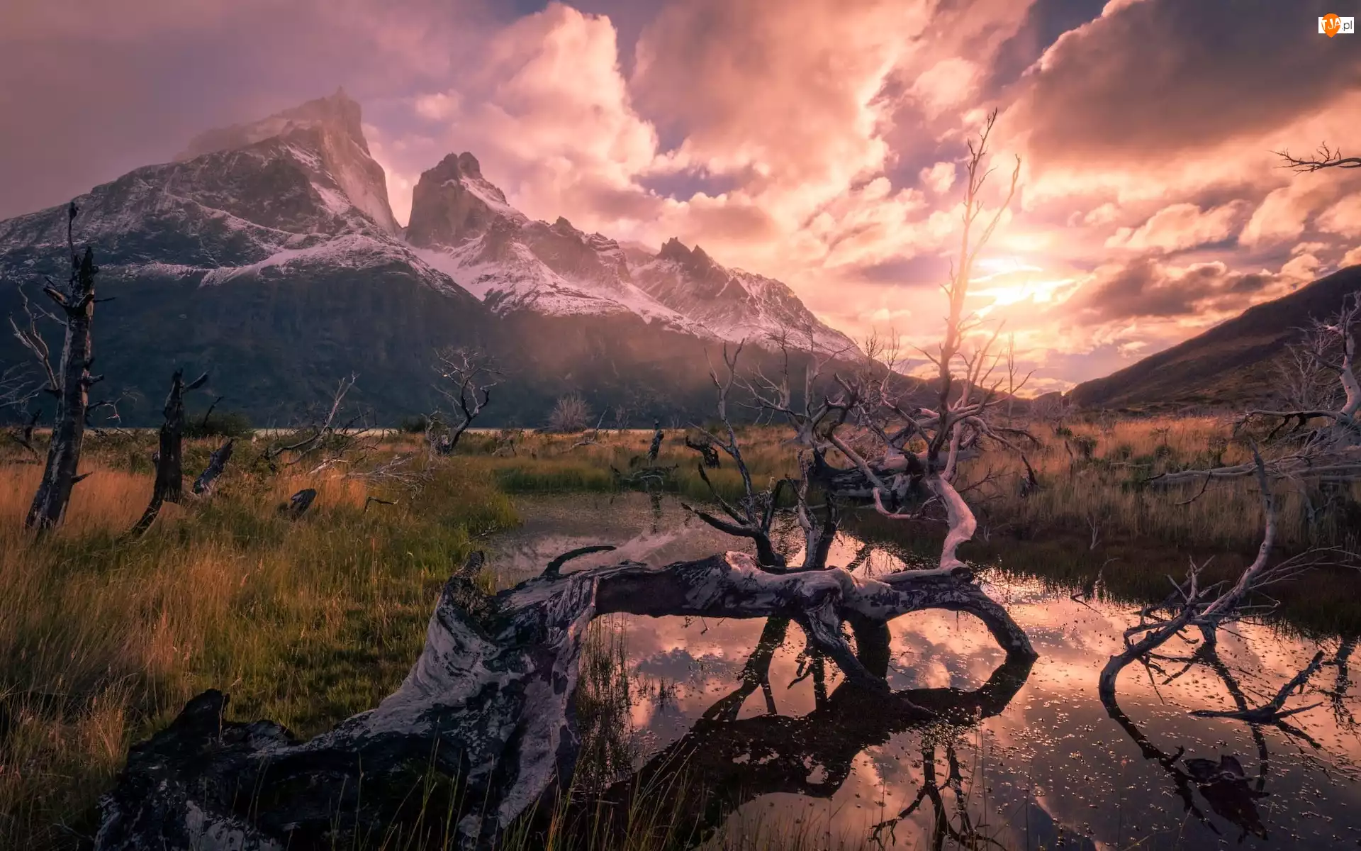 Patagonia, Góry Andy, Park Narodowy Torres del Paine, Chile, Staw, Drzewa, Konar