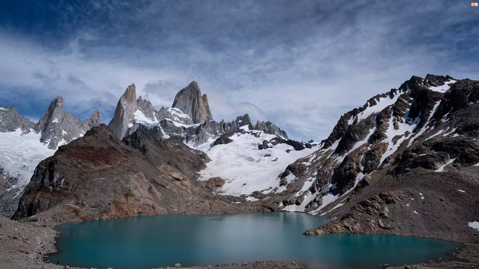 Patagonia, Góry, Niebo, Argentyna, Lagoon de los Tres, Jezioro, Śnieg