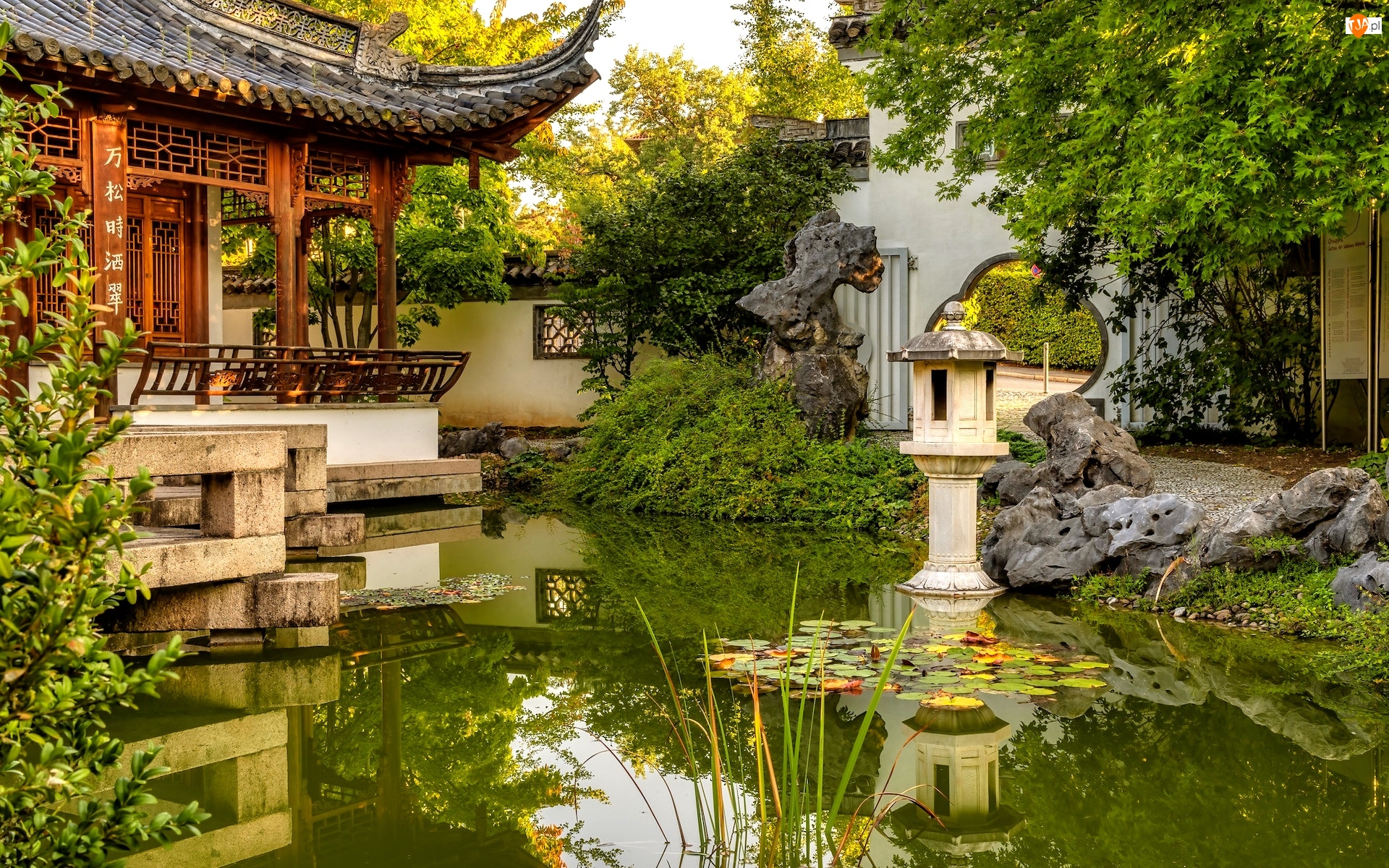 Stuttgart, Niemcy, Pawilon, Roślinność, Ogród chiński, Staw