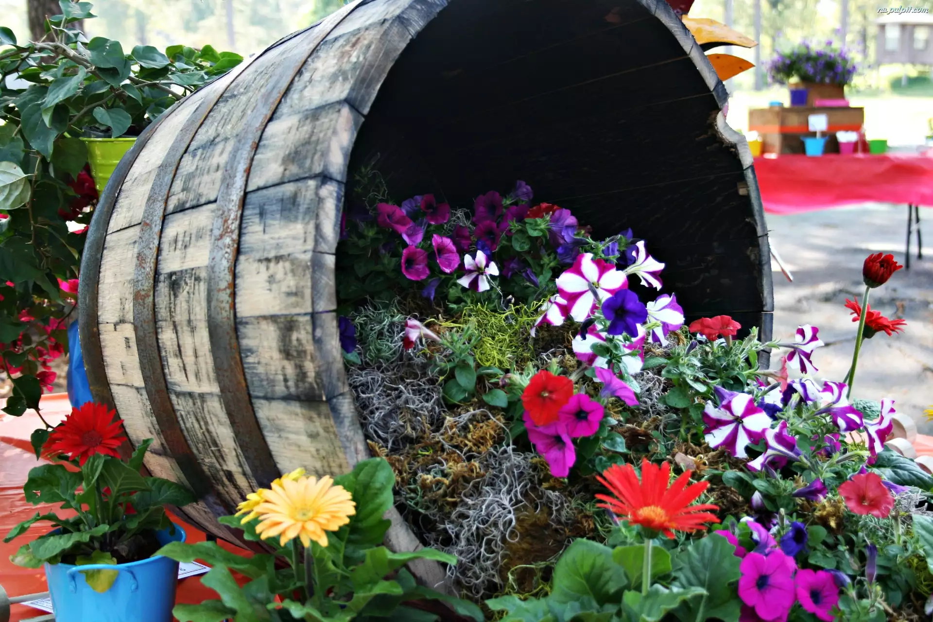 Petunie, Beczka, Kwiatowa, Kompozycja, Gerbery