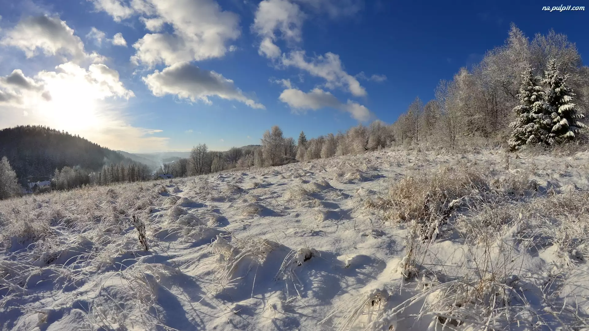 Oszroniona, Łąka, Drzewa, Zima, Trawa, Śnieg