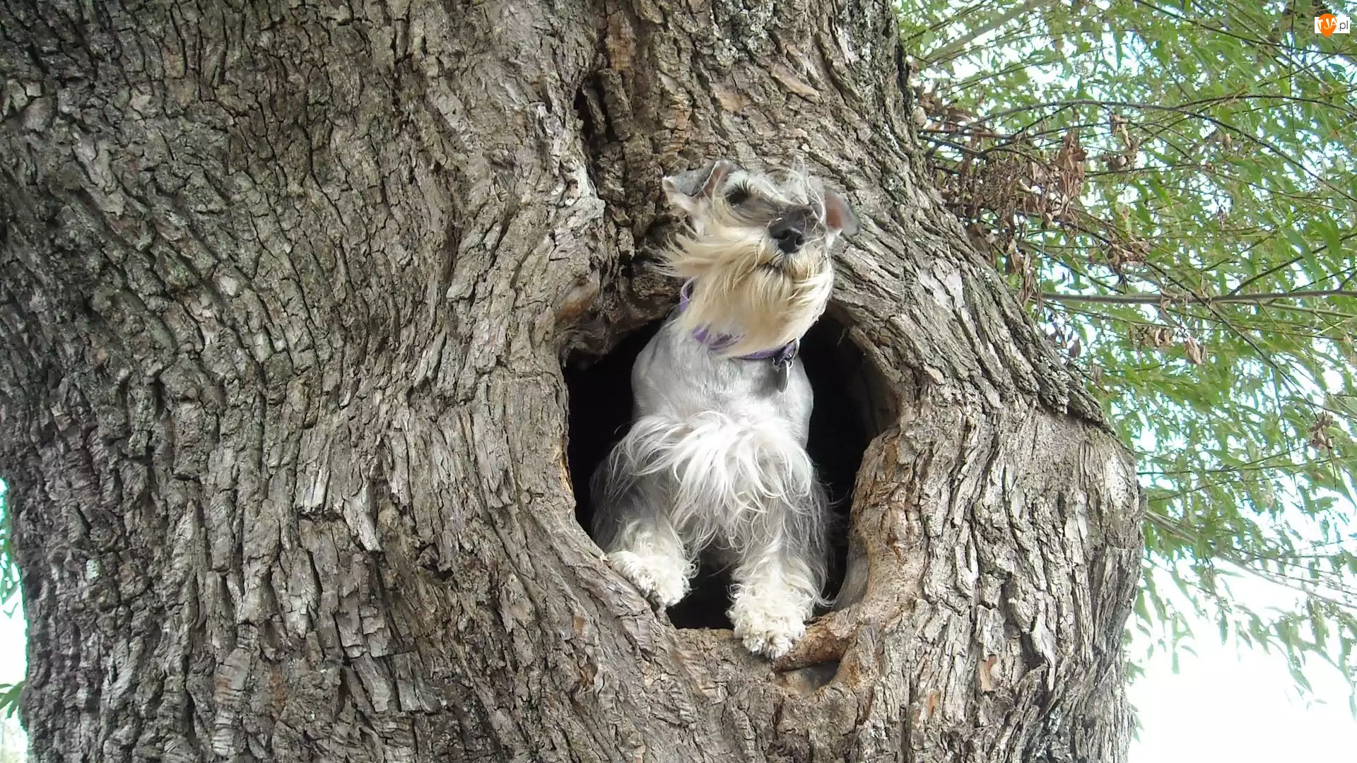 Pies, Sznaucer miniaturowy, Drzewo, Dziupla