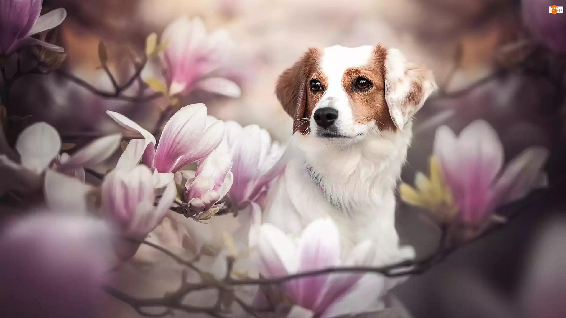 Spojrzenie, Magnolie, Płochacz, Pies, Kwiaty