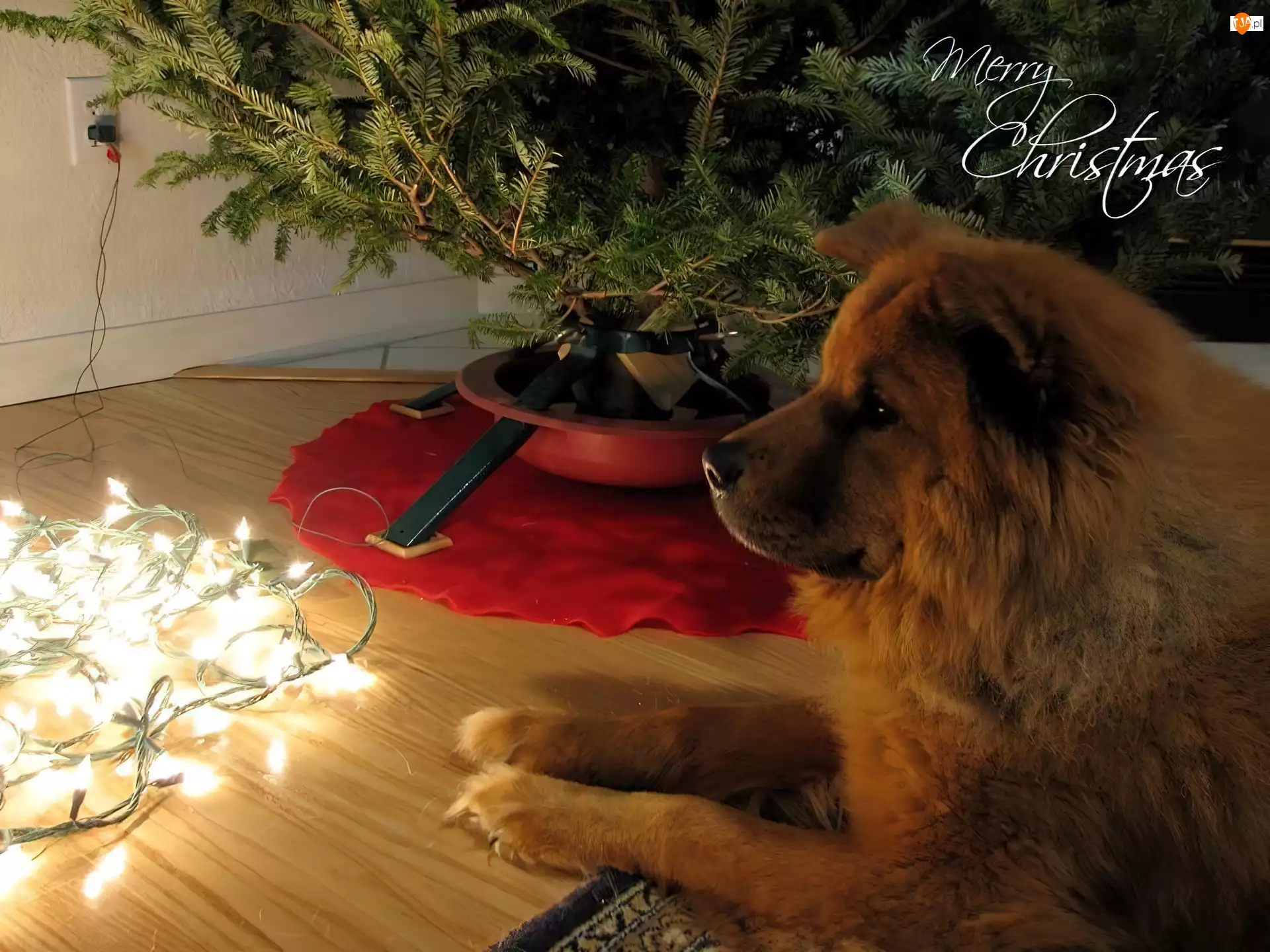 Pies, Wyczekiwanie, Lampki, Choinka