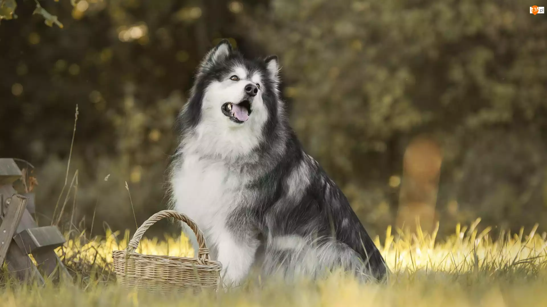 Kosz, Pies, Alaskan malamute, Trawa