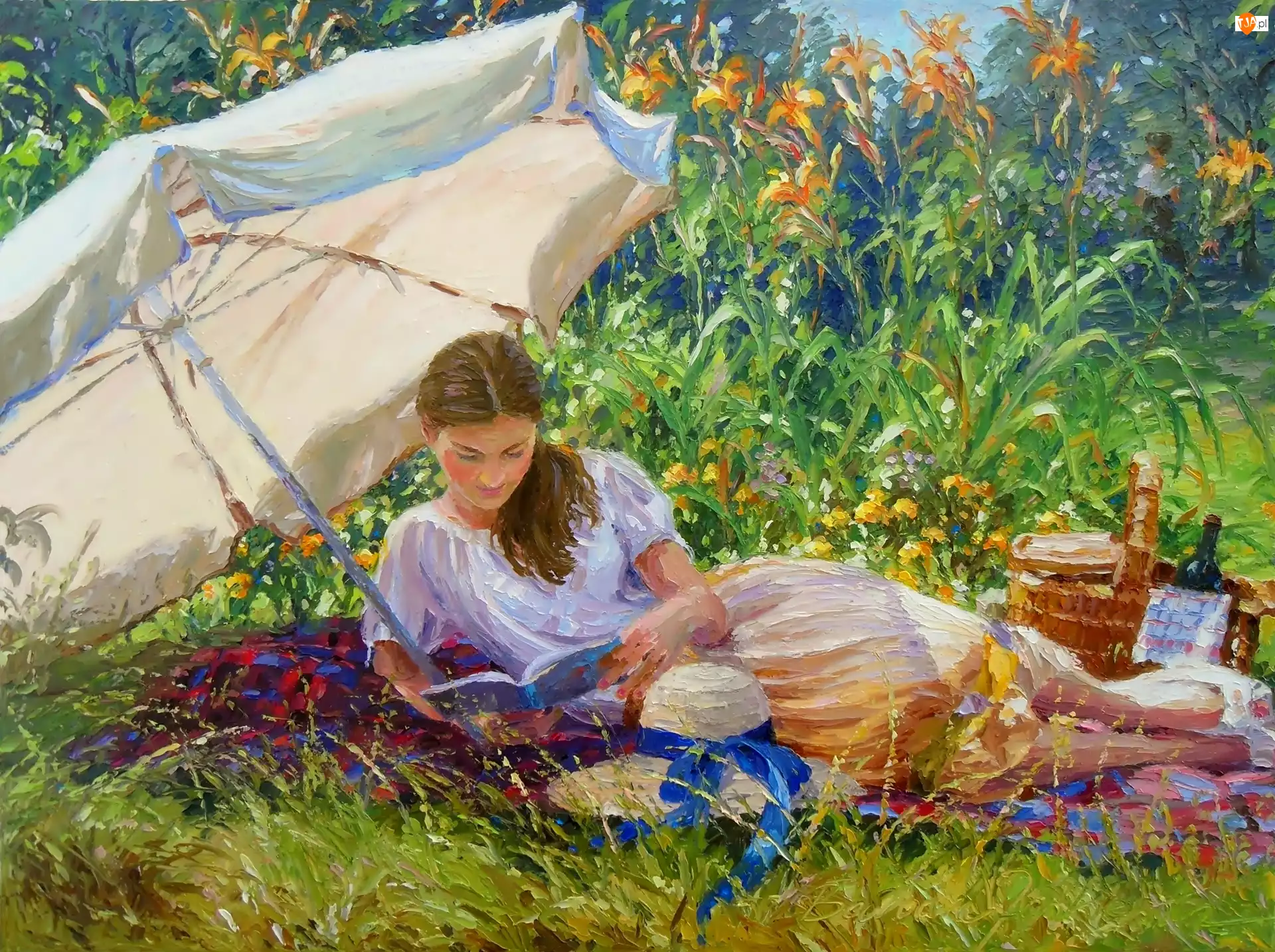 Piknik, Malarstwo, Kobieta, Łąka, Parasol
