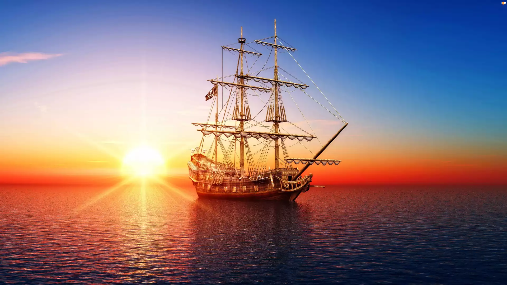 Piracka, Wschód, Żaglowiec, Słońca, Flaga, Mor